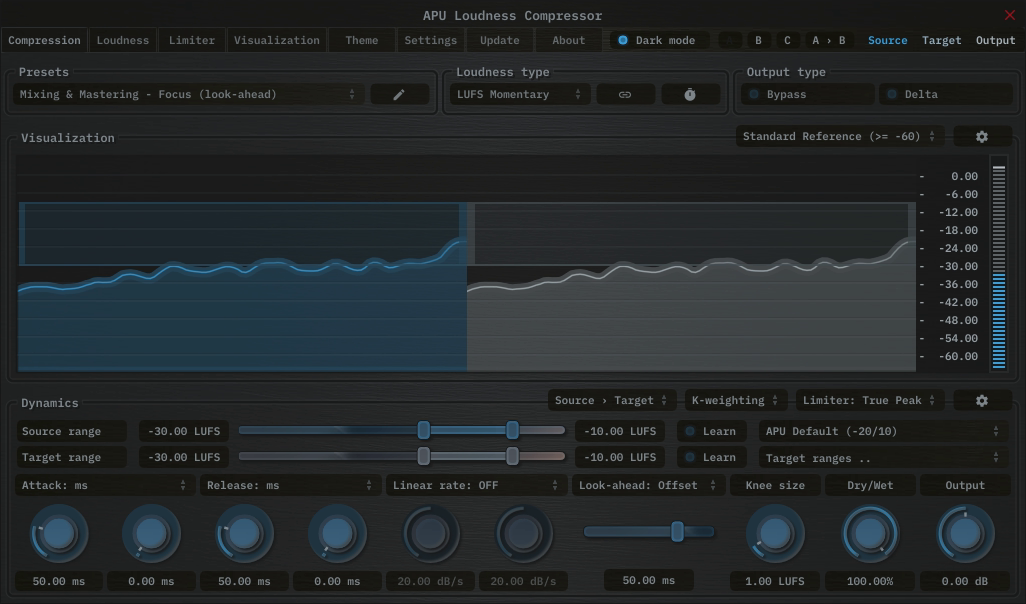 The compression tab contains configuration and visualization for loudness compression/expansion. This section details each of the individual parameters and components.