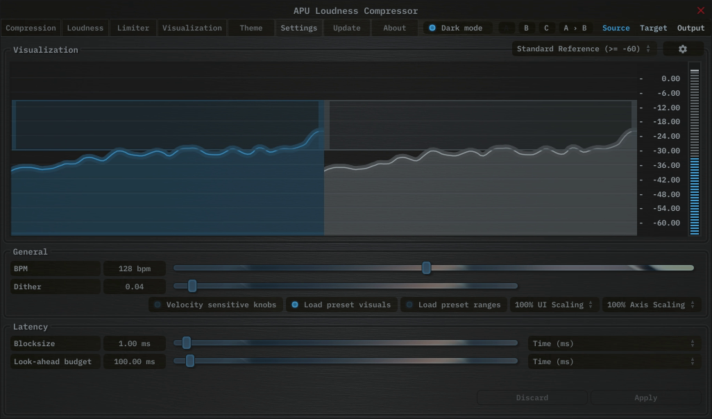 The settings tab contains various additional parameters. These parameters are broken down between General and Latency parameters. Since Latency parameters impact delay compensation, changes to these parameters are deferred until you click the Apply button. It is generally not advisable to automate the parameters in the Latency section.