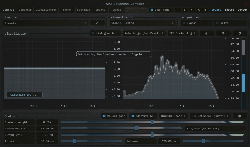 APU Loudness Contour is an ‘equal-loudness’ contour plug-in released by APU Software, LLC. This plug-in is designed to apply a variety of ‘equal-loudness’ filters to audio. Here you can read about the different features and parameters available with the plug-in.