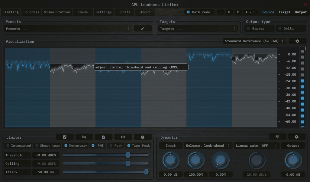 APU Loudness Limiter is a modern loudness limiter plug-in released by APU Software, LLC. This plug-in is designed to simultaneously perform limiting across multiple loudness types (see loudness type). Here you can read about the different features and parameters available with the plug-in, and get a general sense of how it differs from other limiters and why.