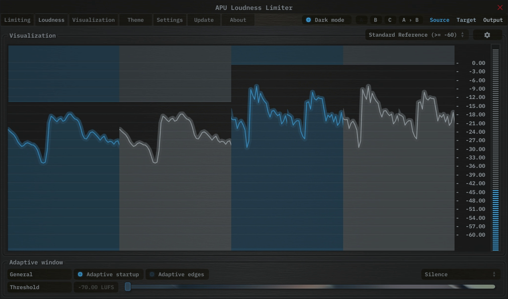 The loudness tab contains parameters relating to loudness measurements. You can configure adaptive window behavior here, which can be used to reduce transient artifacts during compression.