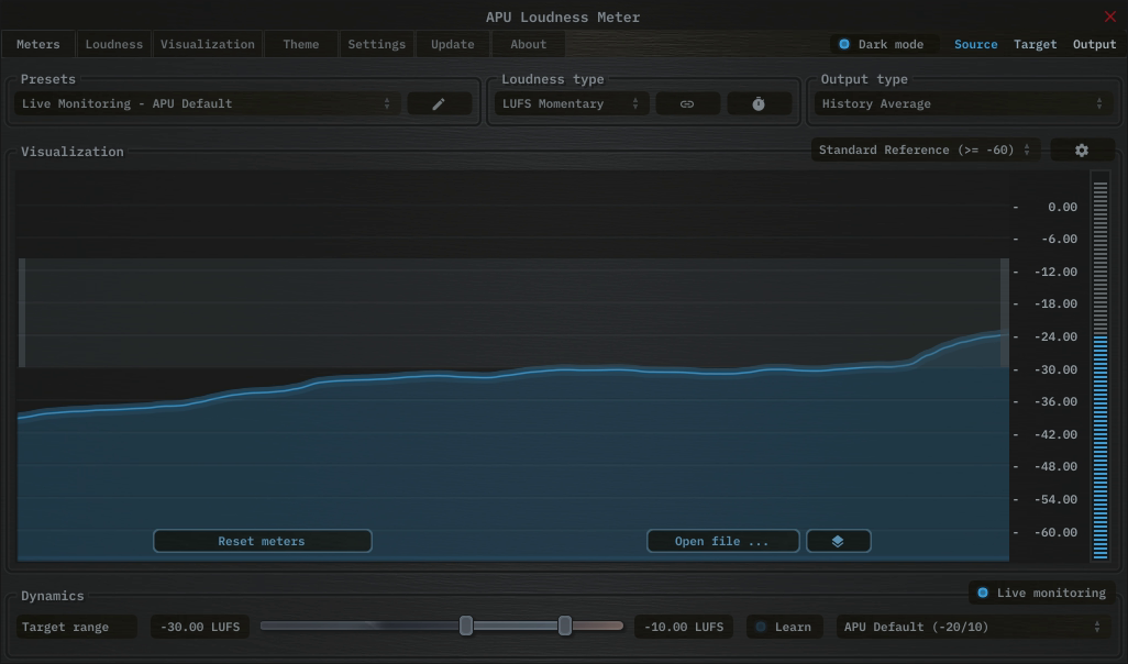 The meters tab contains configuration, visualization, and statistics for loudness analysis. This section details each of the individual parameters and components.