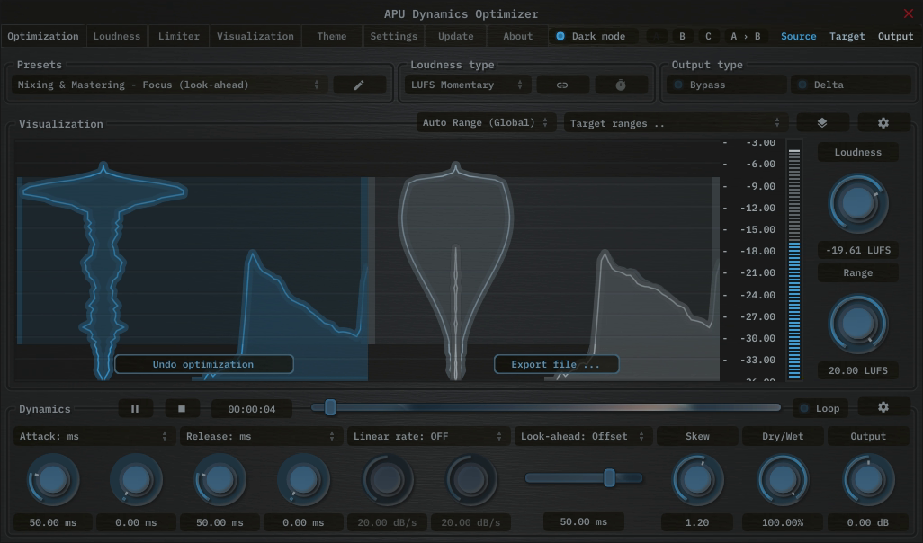 You can also simply select the entire range (100%, 100%) and then adjust the distribution skew parameter to roughly match the shapes. This gives you a good starting point for adjusting the overall loudness and dynamic range after optimization.