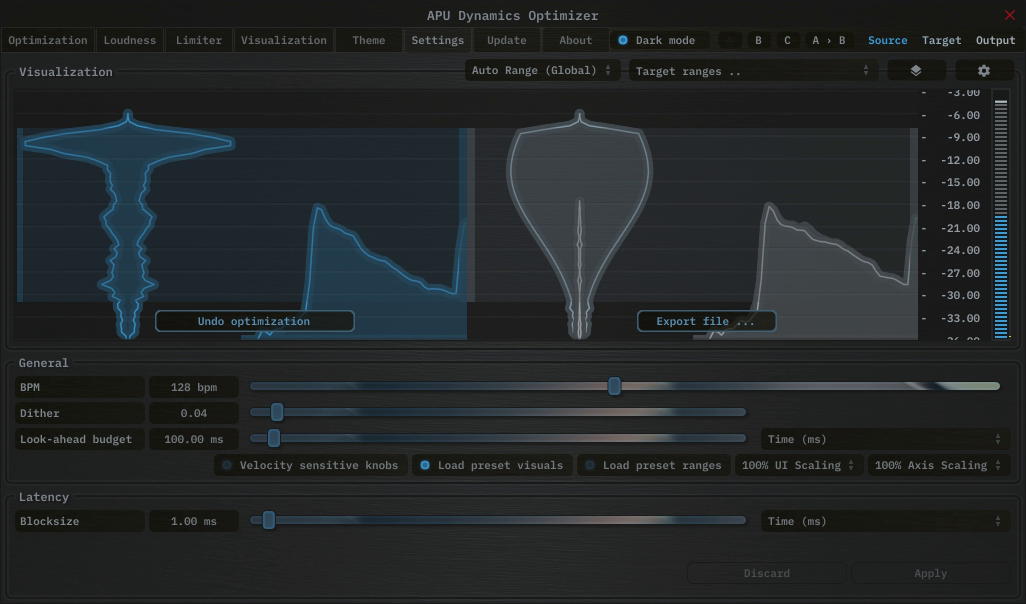 The settings tab contains various additional parameters. These parameters are broken down between General and Latency parameters. Since Latency parameters impact analysis, changes to these parameters are deferred until you click the Apply button, and will require the current file to be closed.