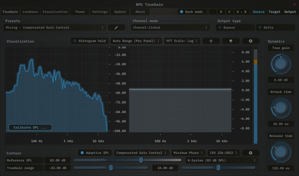 To ensure TrueGain’s perceptual modeling is accurate for your specific environment, a simple calibration process aligns the plugin with the true Sound Pressure Level at your listening position.